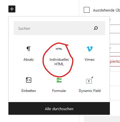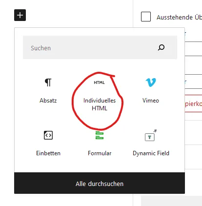 Dazu fügt man einfach einen „HTML“-Block ein, und kopiert dort den Einbettungscode rein.